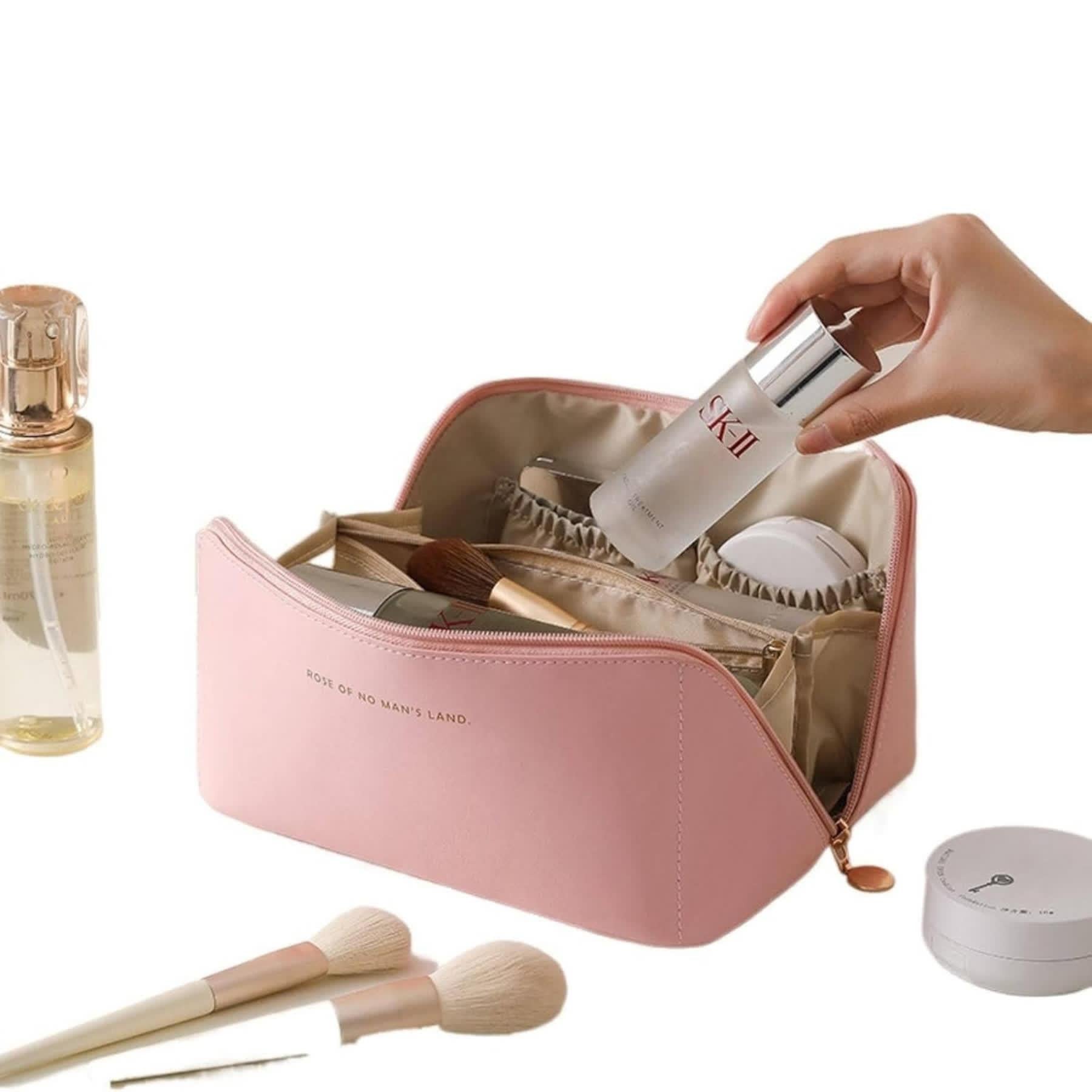 Pembe rengiyle dikkat çeken bu makyaj çantası, iç kısmındaki çoklu bölmeleri ile makyaj fırçaları, kozmetik ürünleri ve cilt bakım malzemelerini düzenli bir şekilde saklamanıza olanak tanır. Dayanıklı fermuarı ve suya dayanıklı iç astarı ile uzun süreli kullanım için uygundur. Minimalist ve zarif tasarımı, hem evde hem de seyahatlerinizde şıklığınızı tamamlarken işlevselliği ön planda tutar.
